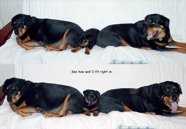 Then I started to realize I have a whole lot of puppy pictures because over the last 20 years I have had 3 puppies, Mocha, Sassy and Ruffin. So why not share them all with my Rottweiler friends. Holy cow, did anyone spot this major gaff? I left out baby Bessie! This should read, ... over the last 20 years I have had 4 puppies, Mocha, Sassy, Ruffin and Bessie. I really must be careful what I write so late at night.